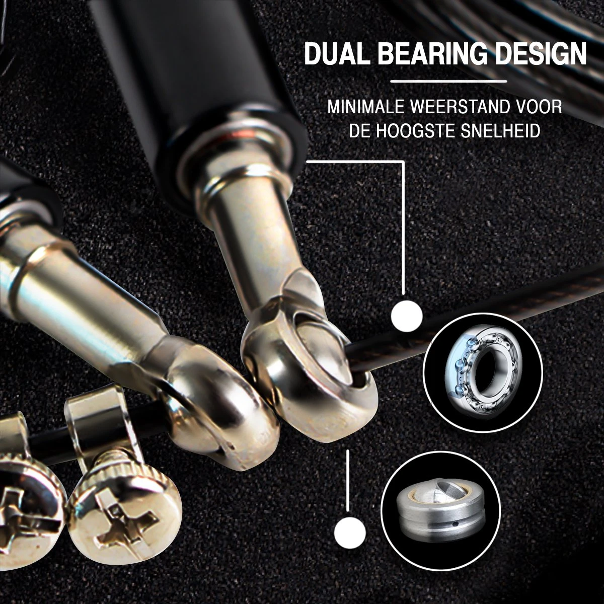 De speedrope bestaat uit een ballscrew (stalen uiteinde van handvat) en twee rvs-kogellagers. In combinatie met de 90° hoek van de kabel zorgt dit voor een hypersnelle wending. Het springtouw is hiervoor uitermate geschik om als speedrope gebruikt te worden voor bijvoorbeeld double-unders. Met een beetje oefening zijn zelfs triple-unders mogelijk!