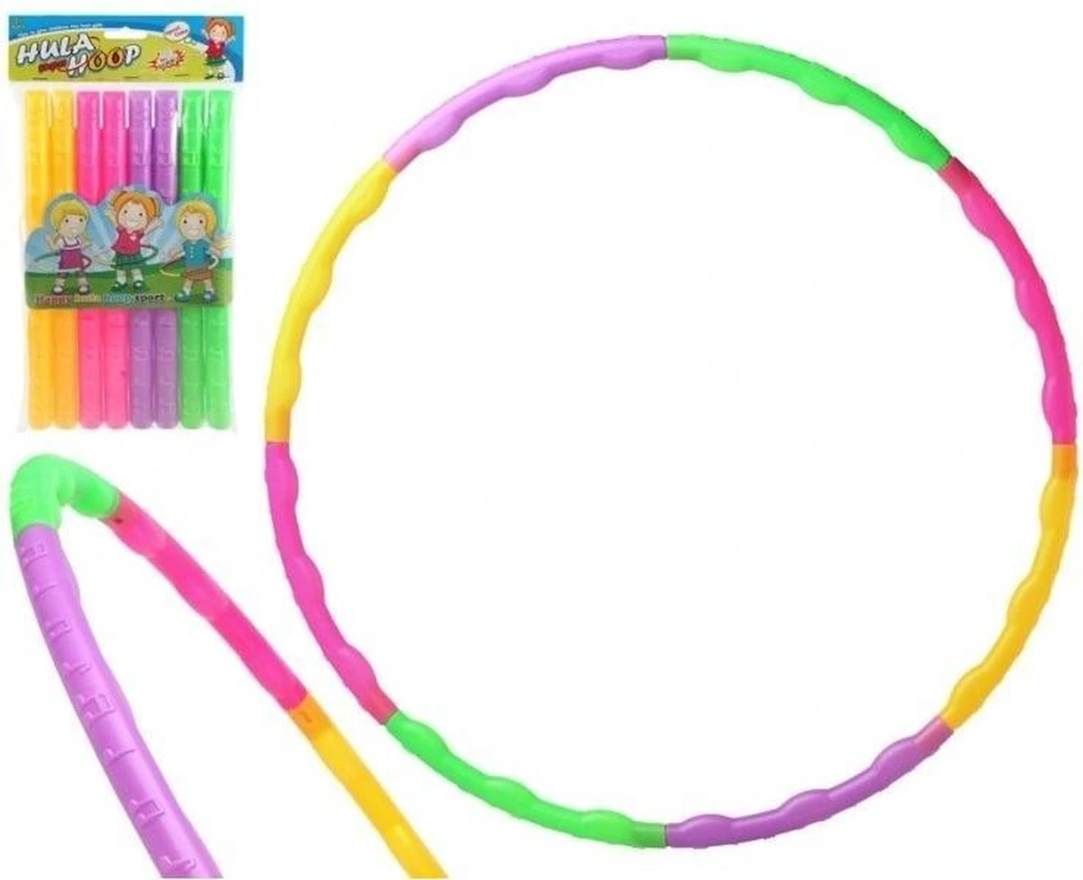 Speelgoed hoelahoep gekleurd voor kinderen. Vrolijke gekleurde hoepel, bestaande uit losse onderdelen. U zet de hoepel gemakkelijk zelf in elkaar. De hoepel heeft dan een doorsnede van ongeveer 65 cm. Materiaal: plastic.