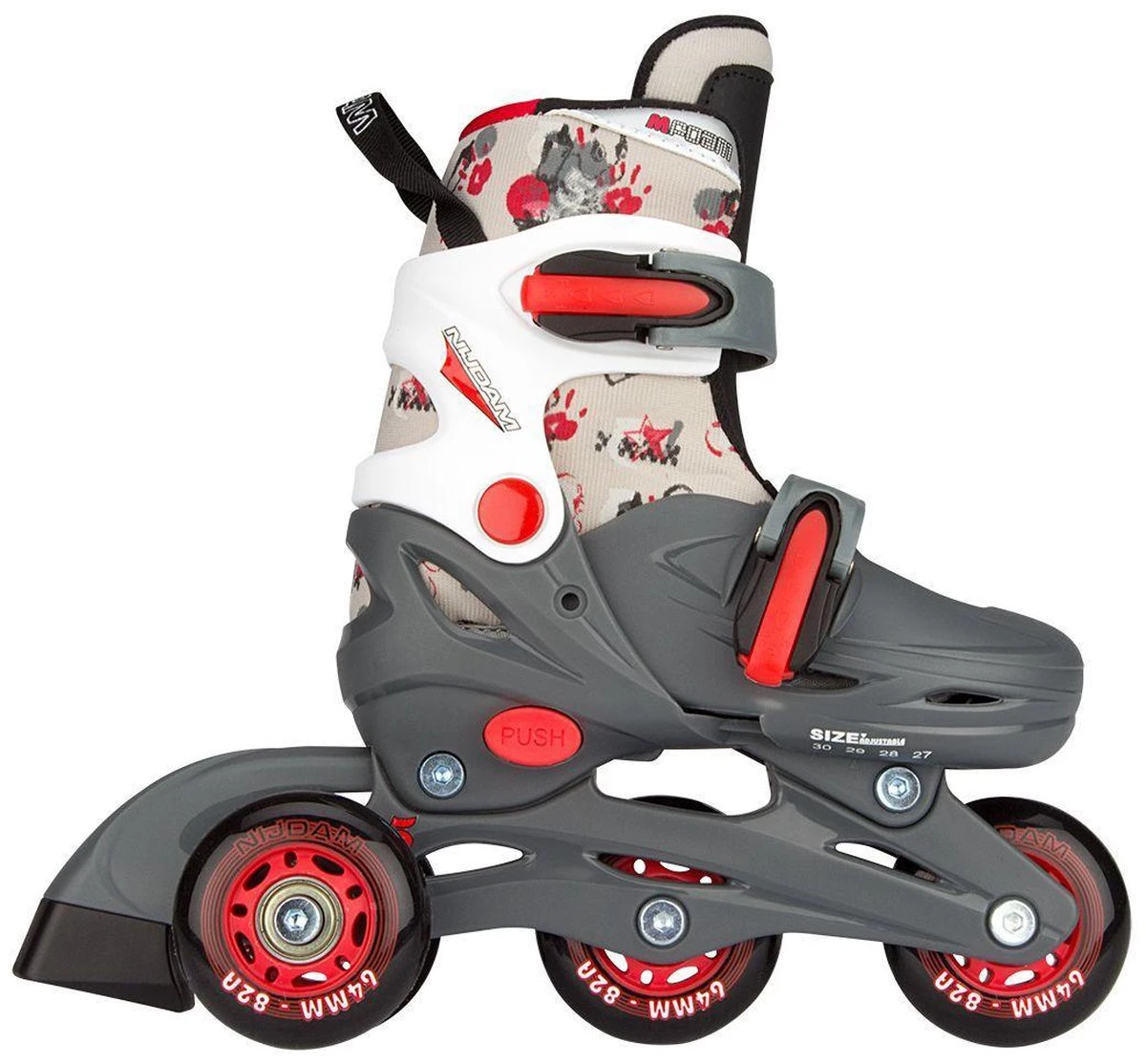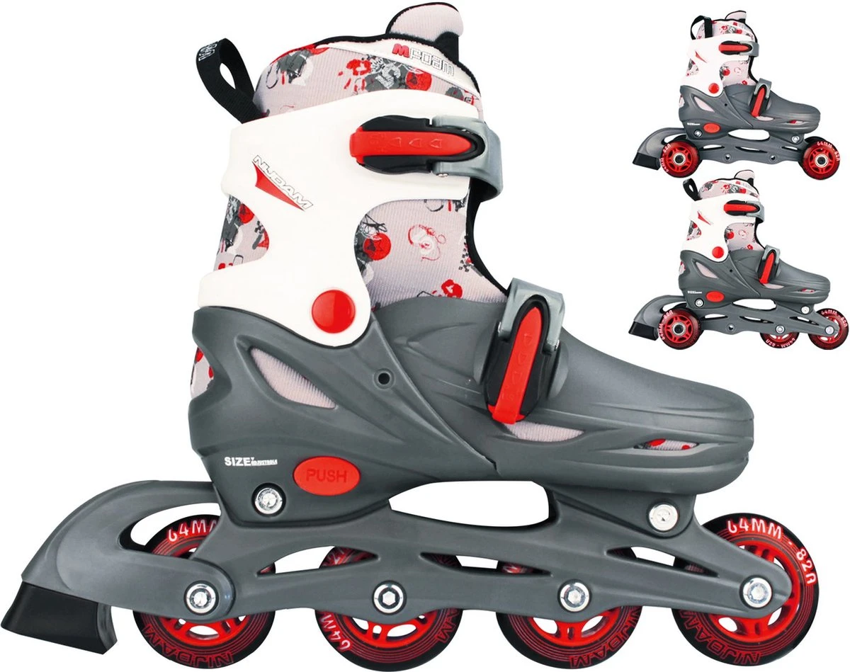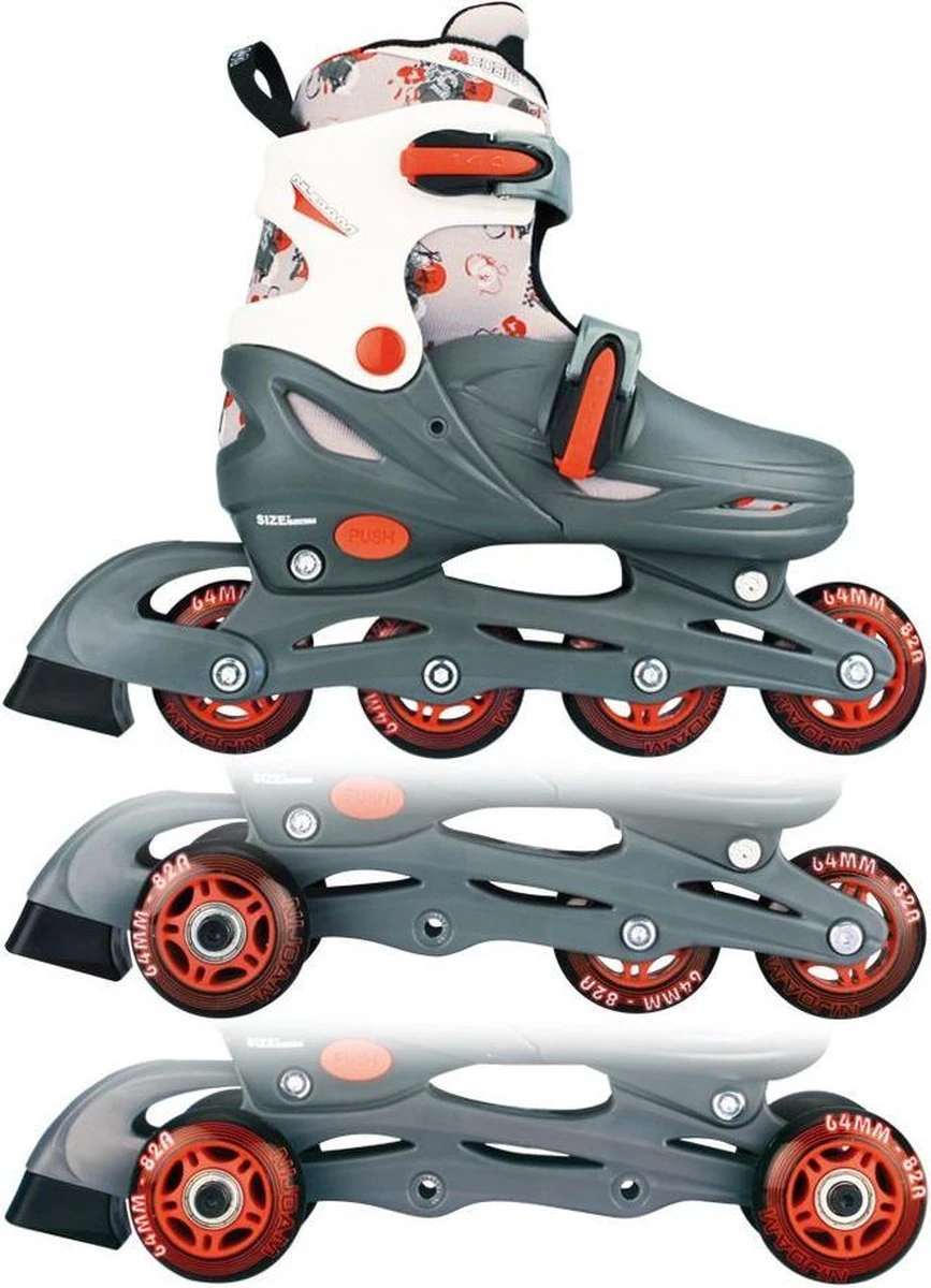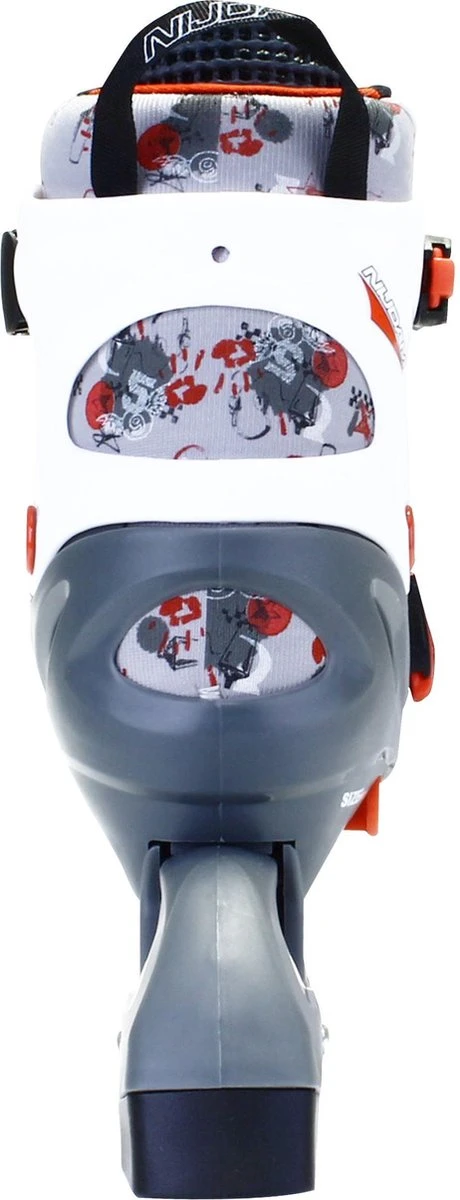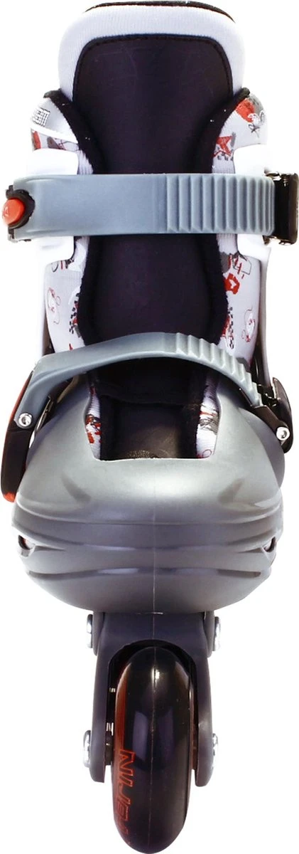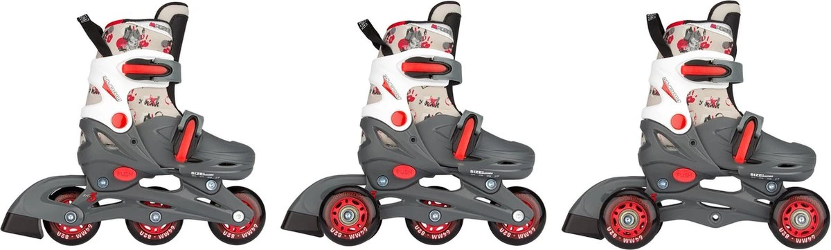 Verstelbare inline skates van Nijdam Junior waarvan je de wielen in verschillende standen in kunt stellen; quad (2×2), trike (1x1x2) en inline (1x1x1x1). Op deze manier kunnen de jonge skaters eerst wennen aan het op wieltjes staan (quad) om vervolgens via de trike door te groeien naar een echte inline skate. De skate heeft een stevige kunststof schoen voor goede support en uitneembare binnenschoen. De schoen is verstelbaar in 4 maten dmv. drukknop aan de hiel.